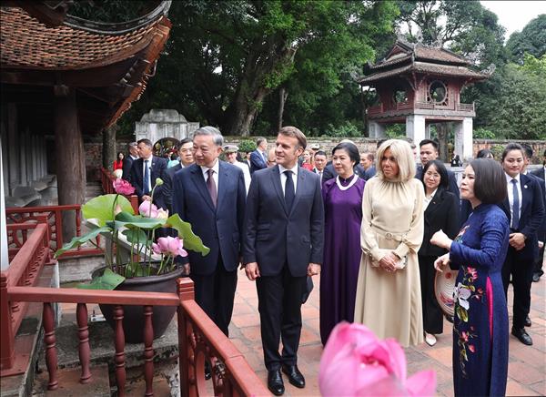 베트남과 프랑스 지도자 부부가 하노이 문묘-국자감 유적지에서 문화 교류 및 우정의 나무 심기를 통해 양국 관계를 강화했다.
