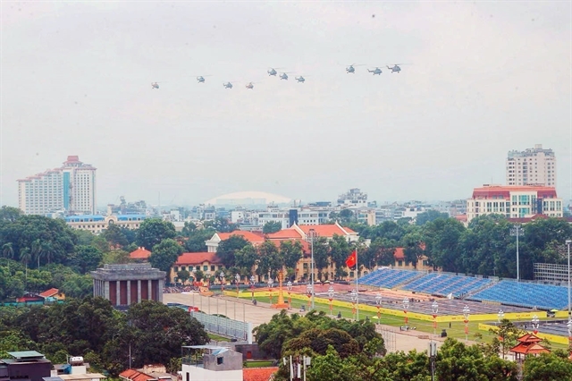 공중방어·공군 부대의 헬기 편대가 하노이 중심부 상공에서 9월 2일 바딘 광장 열병식 리허설을 실시했다.