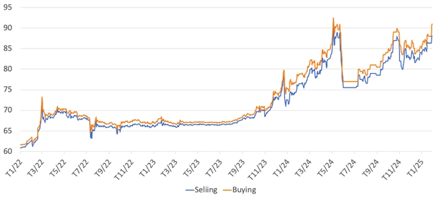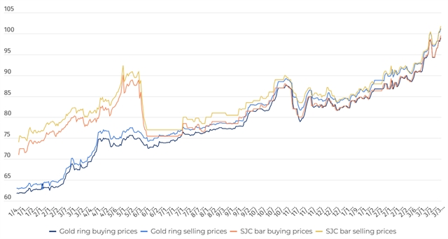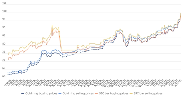 2025년 초부터 베트남에서는 SJC 금괴와 금반지 가격이 크게 상승하였다.