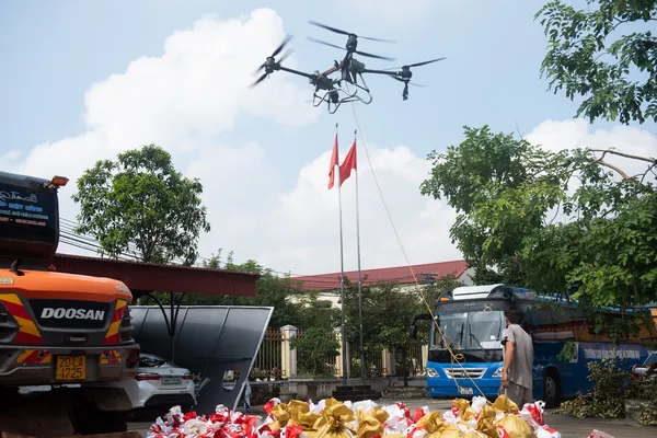전국 자원봉사자들이 농업용 드론으로 Bắc Ninh 홍수 피해 마을에 식량과 필수품을 투하해 고립 주민들에게 긴급 지원을 제공했다.