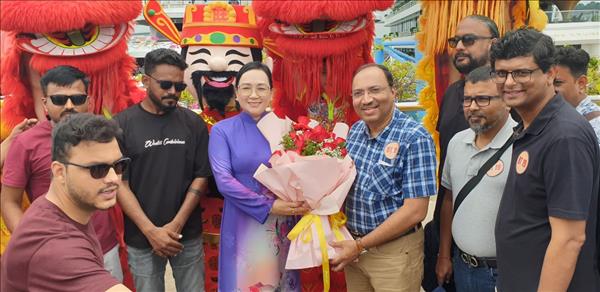 하롱 국제여객 항구에서 인도 관광객들을 환영하며 꽃다발을 전하고 사자춤 공연으로 기념했다.