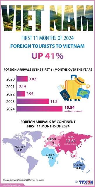 2024년 첫 11개월 동안 베트남은 전년 대비 41% 증가한 1,580만 명의 국제 방문객을 맞이했다.