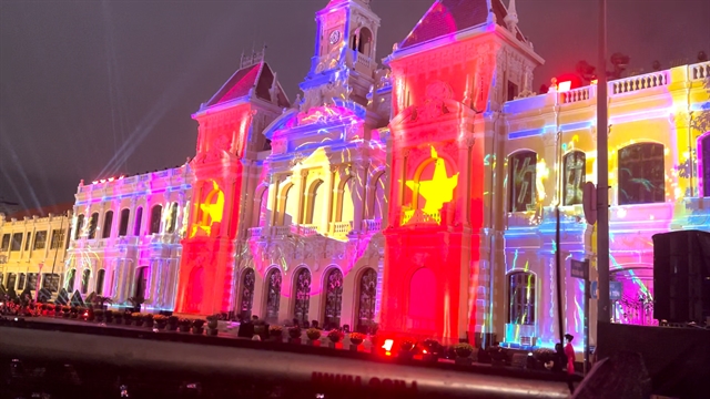 호치민시는 국가 통일 50주년을 기념하여 시청 건물에서 화려한 3D 매핑 공연을 선보였다.